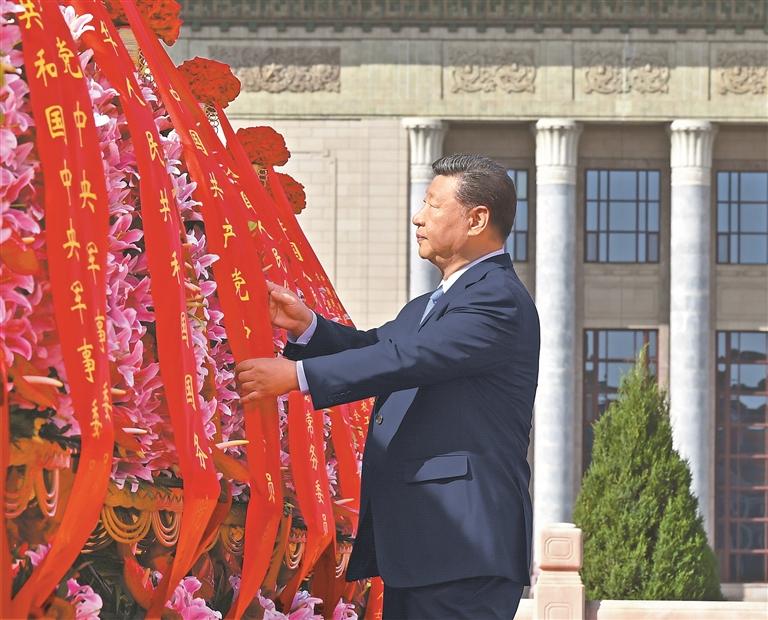 9月30日上午,党和国家领导人习近平、李强、赵乐际、王沪宁、蔡奇、丁薛祥、李希、韩正等来到北京天安门广场,出席烈士纪念日向人民英雄敬献花篮仪式。这是习近平整理花篮上的缎带。新华社记者 李响 摄