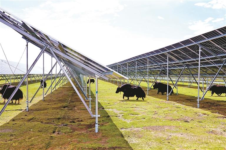 光伏板下悠然吃草的牦牛。本报记者 袁海霞 摄