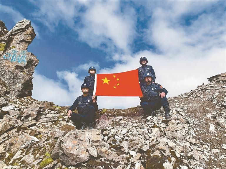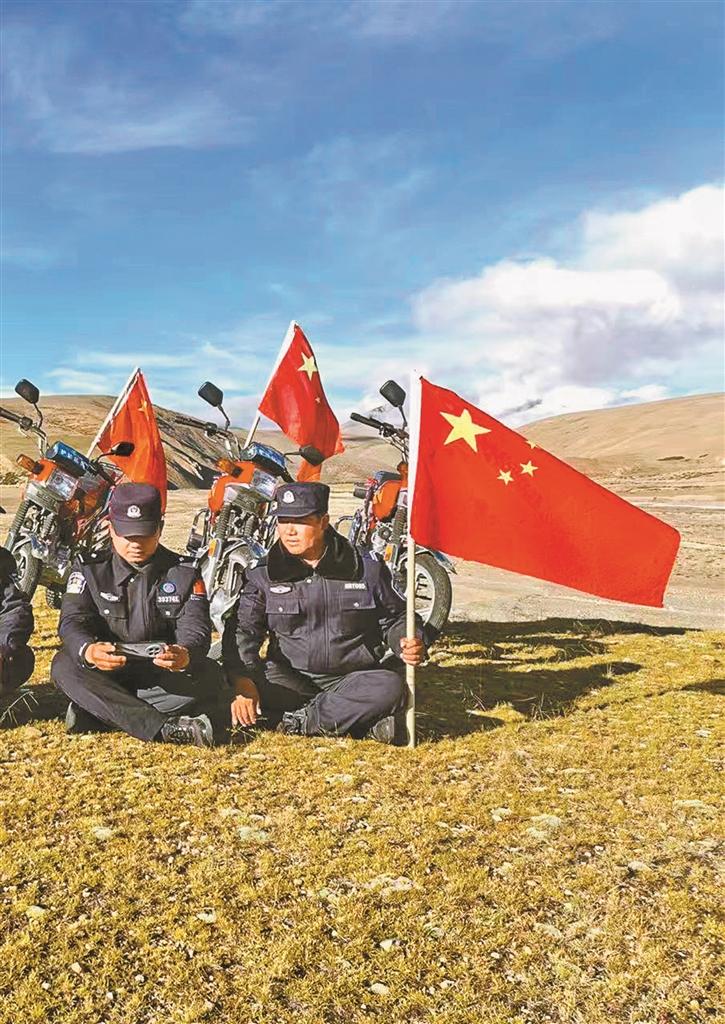 日喀则边境管理支队康布边境派出所民警在边境一线与国旗合影。本报记者 王敏 本报通讯员 周伟 摄
