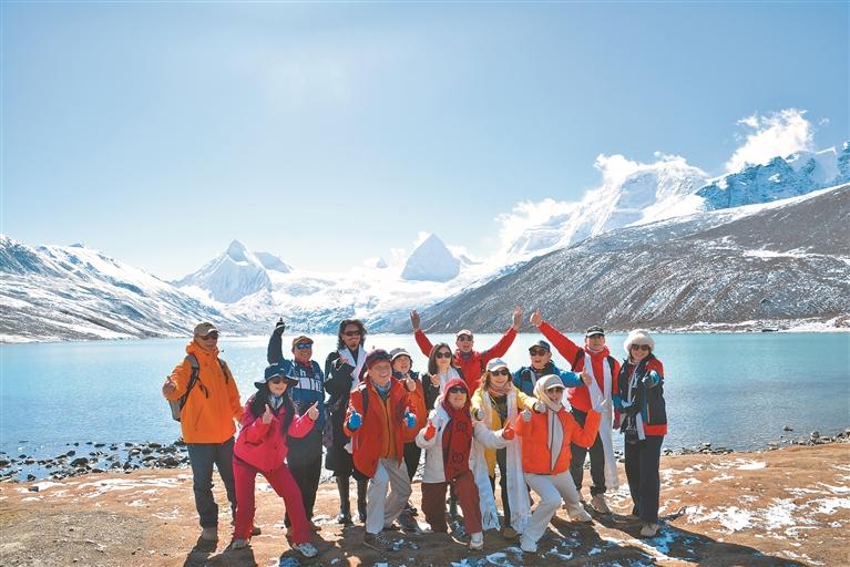 图为电影主创人员与比如县萨普旅游景区游客合影。本报记者 汪纯 摄