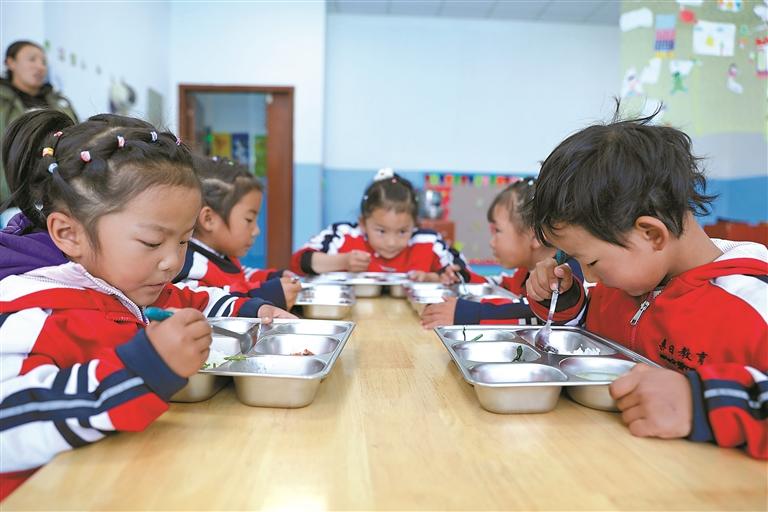 扎嘎新村的幼儿园里,孩子们正在吃营养餐。本报通讯员 侯勇 嘉措 摄
