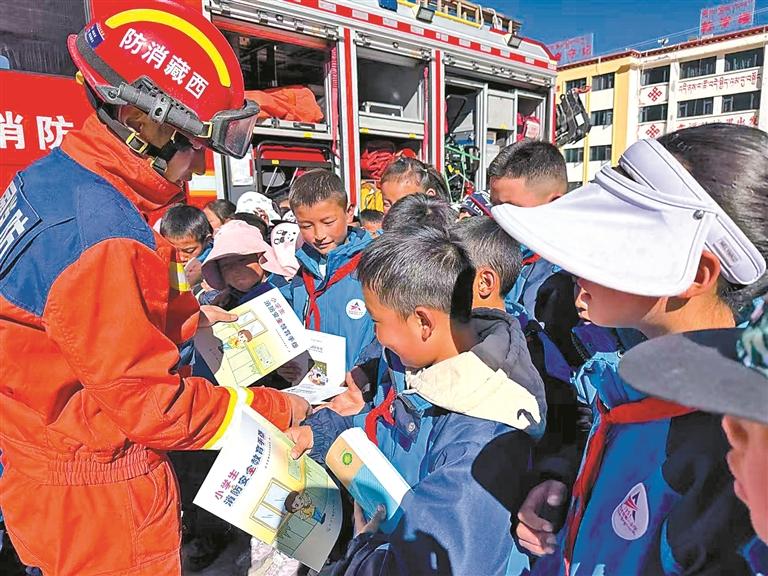 图为昌都市类乌齐县消防救援大队宣传员开展消防宣传进校园活动。江拉 摄
