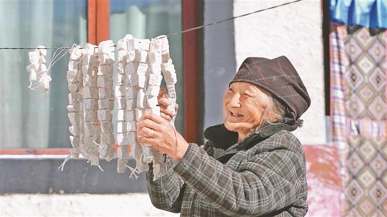图为墨竹工卡县日多乡拉龙村一位老人在晾晒奶渣。