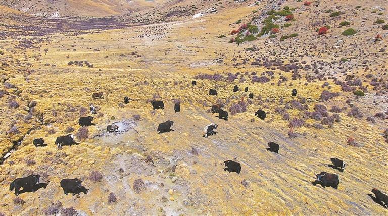 图为墨竹工卡县日多乡拉龙村4组的牧场上,牦牛在悠闲地吃草。本报记者 格桑伦珠 摄
