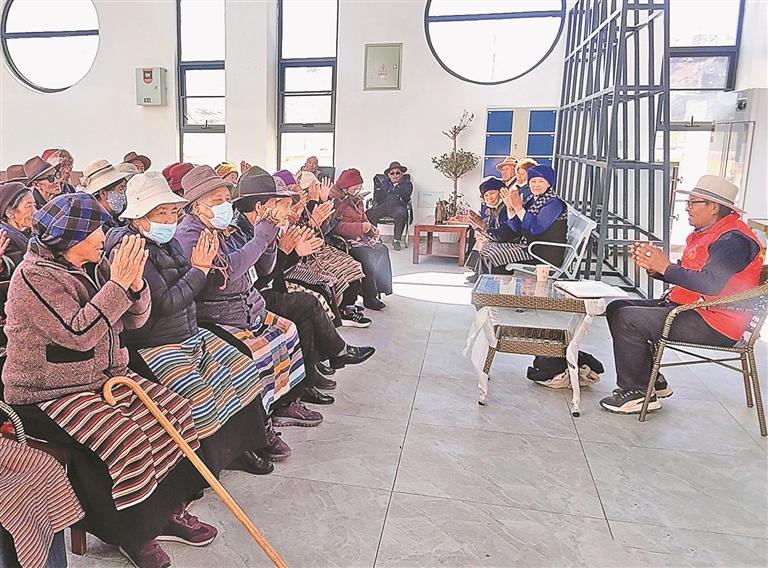 图为拉萨市曲水县曲水村日间照料中心的志愿者生动形象地讲解全会提出的有关健全社会保障体系等内容,引得老人们阵阵喝彩。本报记者 王敏 本报通讯员 郝一男 摄