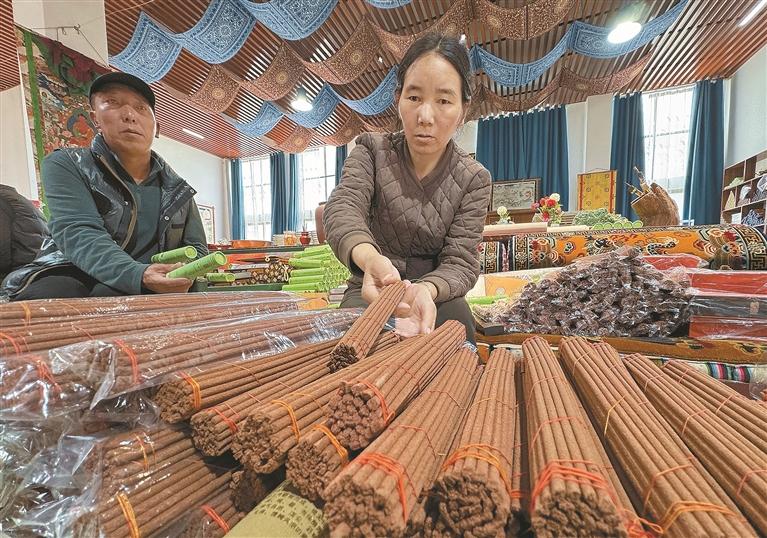 图为昌都市贡觉县堤无玛艺术传承专业合作社的员工在包装藏香。
