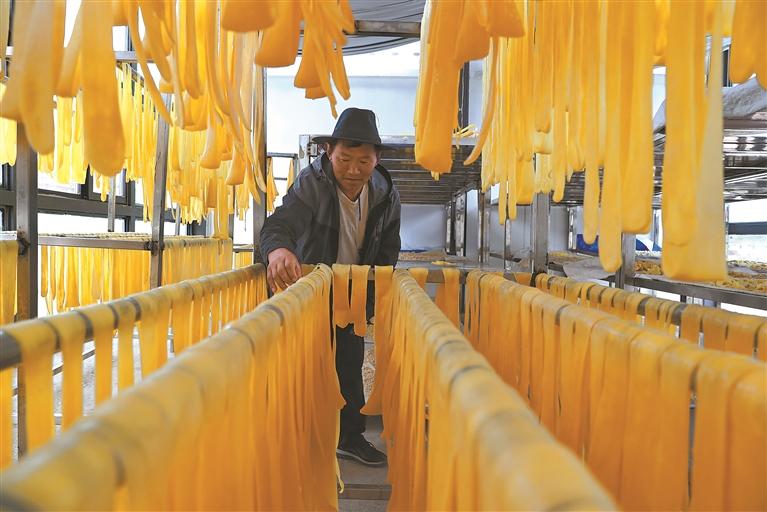 图为那曲市嘉黎县麦地卡乡的牧民在合作社车间晾晒奶制品“拉拉”。本报记者 白玛泽旺 次仁平措 摄