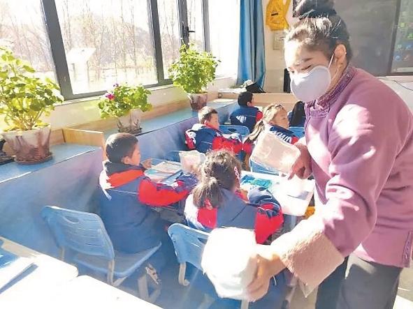 图为工作人员为学生发放宣传手册、学习用品等。本报记者 央金 摄