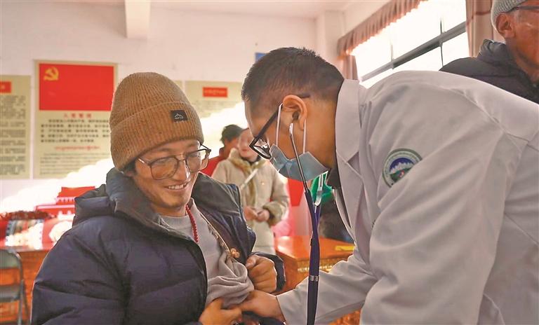 图为援藏医疗专家为群众听诊。