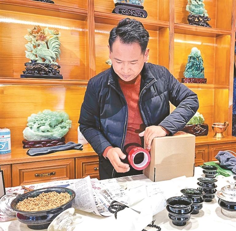 图为销售负责人曲朗在对玉石碗打包装箱。本报记者 扎西顿珠 摄