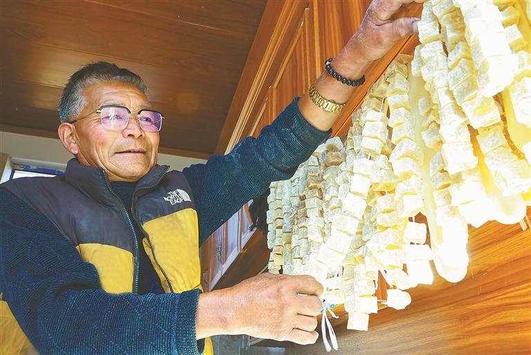 图为墨竹工卡县工卡镇格桑村奶牛良种养殖户挡桑晾晒奶渣。本报记者 黄志武 本报通讯员 洛克 摄