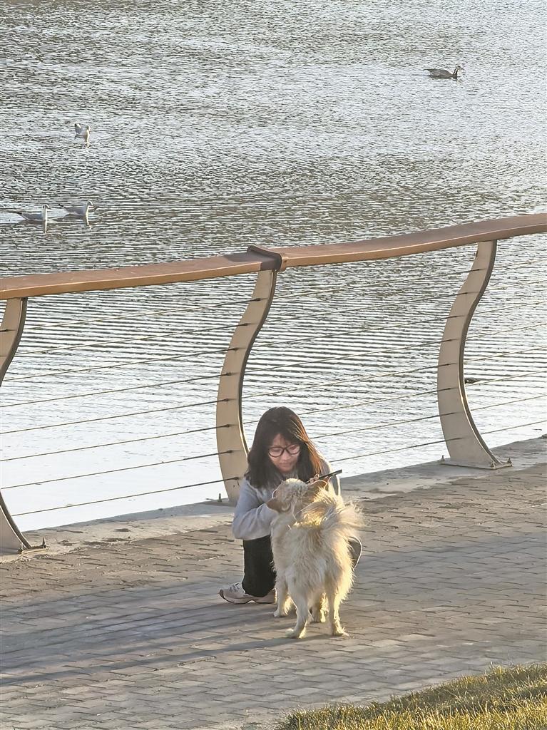 图为拉萨河畔,居民和爱犬亲昵互动。