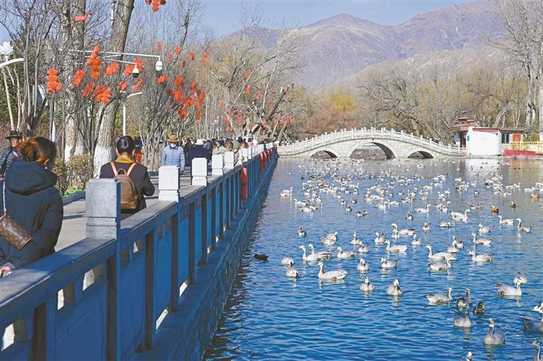 图为市民漫步湖畔,与候鸟近距离接触。本报记者 索朗旺久 摄