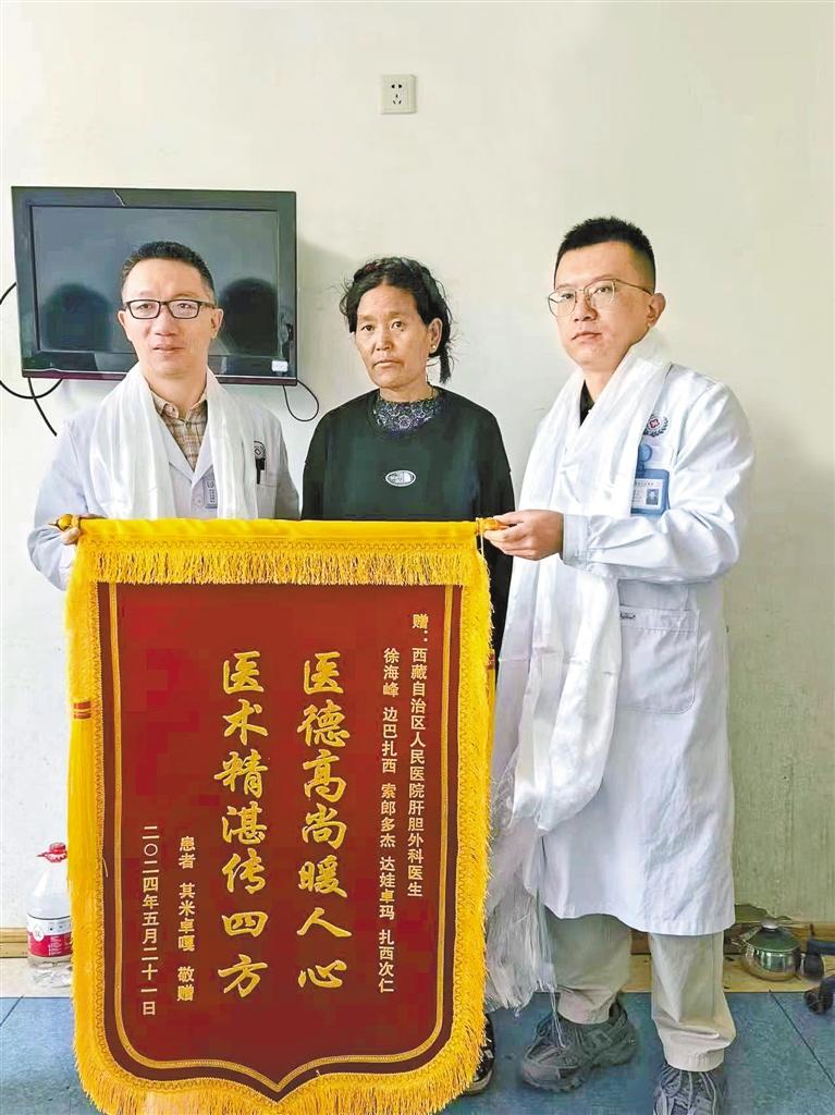 第九、十批北京协和医院援藏医生徐海峰(左)接受出院患者赠送的锦旗(资料图片)。