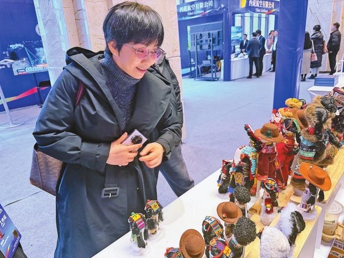 与会嘉宾在企业展位前欣赏文创产品。本报记者 索朗琼珠 摄