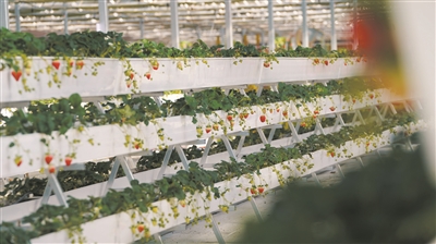 图为工作人员查看草莓长势。