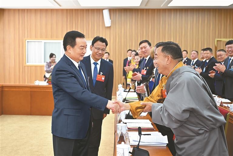 2月1日下午,自治区党委书记王君正参加自治区十二届人大四次会议阿里代表团审议。这是审议开始前,王君正与代表握手交谈。